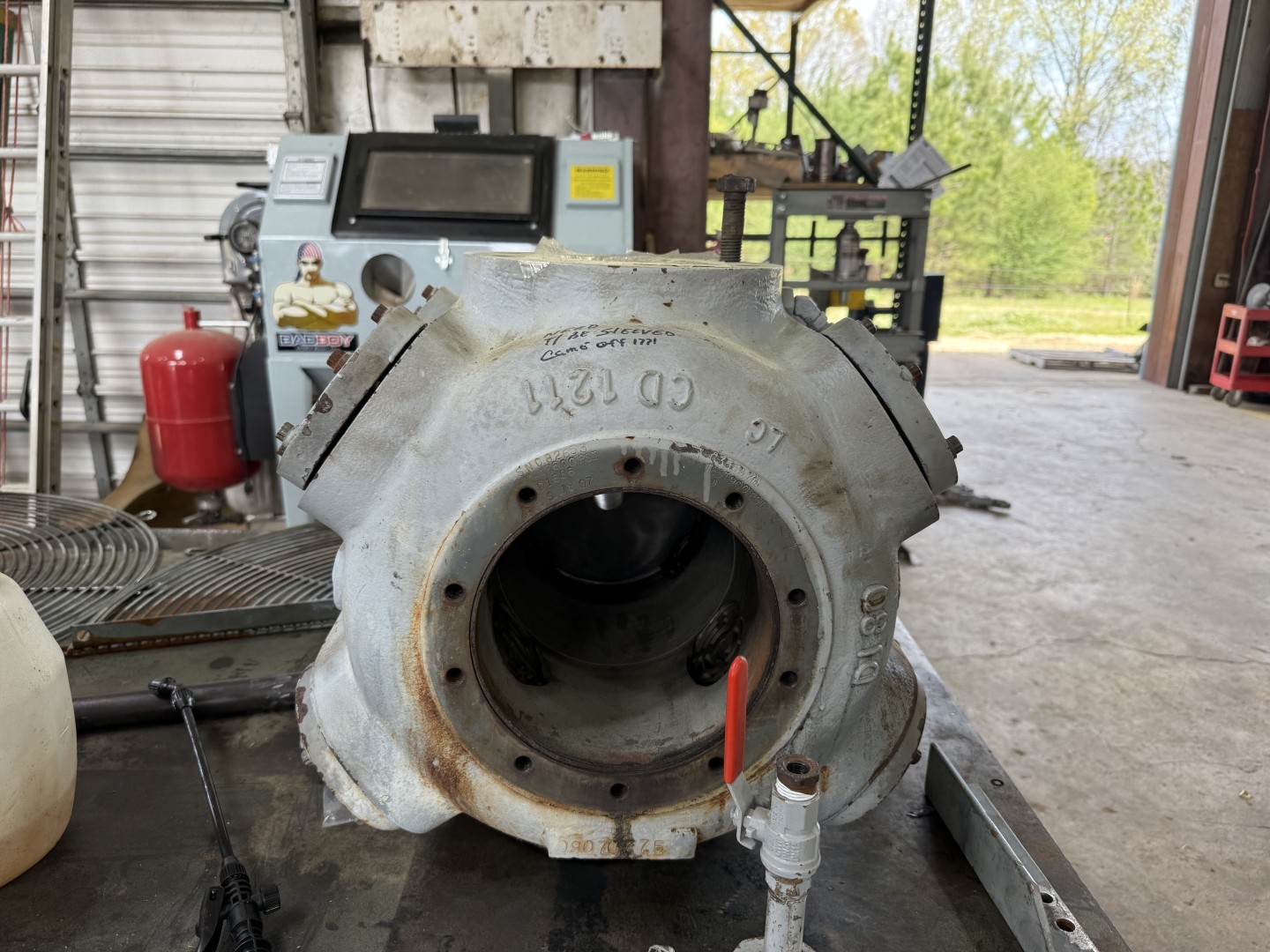 This is a good reconditioned cylinder that had the bore sprayed back to standard by Washington Iron Works. The cylinder comes with valves, caps, and chairs.